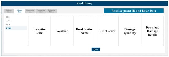 This study describes a self-managed pavement management platform established by the road construction contractors. This platform divides the contracted maintenance areas into 100 m road segments, with detailed information for each segment, including basic data from inspection activities such as inspection date, weather conditions, and location. The system calculates various pavement condition indicators, including the E-PCI, AARI, PCI, and IRI values, and records them over time. Using this set of contractor-specific design requirements, pavement damage characteristics are quantified and presented numerically for the owner’s reference. Below are the data for the road segments and each inspection block.