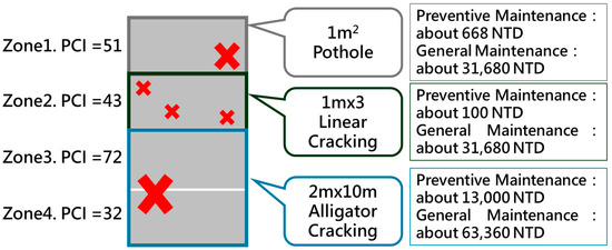 By utilizing the system’s database for cost–benefit analysis, the cost difference between preventive maintenance and routine maintenance is illustrated in the Figure 13. Additionally, the system can serve as a basis for analyzing the effectiveness of various construction methods in addressing pavement distress (Table 6).