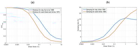 As mentioned earlier, we used the simple shear modulus degradation model proposed by Sun et al. (1988) [58] for clay and the model proposed by Seed and Idriss (1970) [52] for sand (G/Gmax is a function of the shear strain). For damping variation with shear strain, the curves of Idriss (1990) are used for both clay and sand [59]. These selected models are illustrated in Figure 3, and their key parameter values are presented in Supplementary File, section (c).