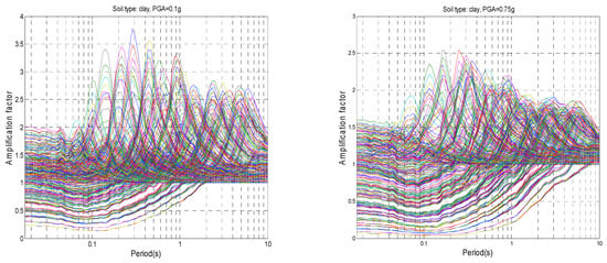 Average amplification factors for 324 sets of clay soil profiles at 0.1 g and 0.75 g PGA levels.