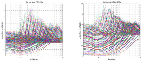 In total, 99,792 AF(T) curves are computed using (Equation (1)) for the 324 soil profiles under the 14 seismic excitations normalized by 11 PGA levels for the two types of soils (clay and sand). The AF curves for clay are shown in Figure 4, and those for sand are shown in Figure 5. They may be written in the general form of , where