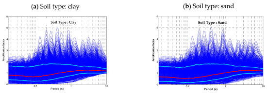 - The “initial variability” associated with the average AFs (Table 3) has a maximum value at low to intermediate periods (0.01 to 0.4 s), reaching up to 0.39 for clay and 0.47 for sand soil. It then gradually vanishes with the period’s increase, reaching a value of around 0.065 at T = 10 s.