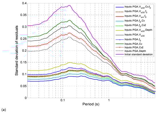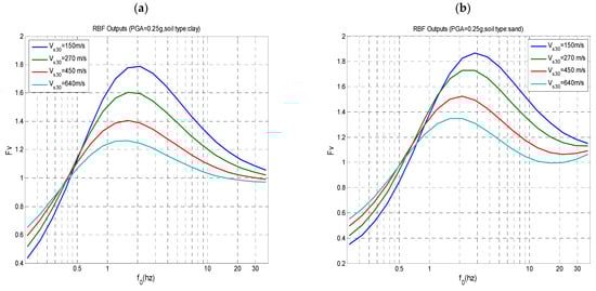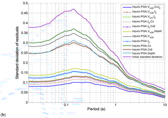 To overcome the above limitation, our study considers the following parameters in addition to the Vs30: the depth of deposit to bedrock (depth); the average shear velocity () over that depth; the velocity contrast, that is, the ratio between the shear wave velocity in the bedrock and at the surface (Cv); the second velocity contrast, that is, the ratio between the shear wave velocity in the bedrock and the average shear wave velocity over the upper 30 m (Cv2); the soil profile’s fundamental frequency (); and the PGA in the bedrock. The inclusion of the PGA as a parameter of the study is justified by the well-established fact that site amplification for nonlinear soil is fundamentally dependent on the intensity of the input wave. The site proxies considered are calculated using Relations (8) to (13) as follows: