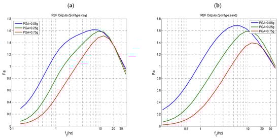 - As shown in Figure 4 and Figure 5, the corresponding peak amplification ranges from less than 1.0 to 4.0 and up to 5.0 for low levels of PGA (0.01 g to 0.05 g). However, increasing the PGA level results in a decrease in the peak amplification factors to values of around 2.0 to 2.5 for a PGA ranging from 0.75 g to 1.05 g. The average amplification factors for clay are generally higher than those for sand at the mean (2 Hz ≤ f < 5 Hz) and high (f ≥ 5 Hz) frequency ranges.