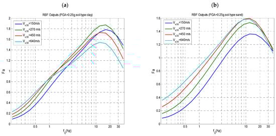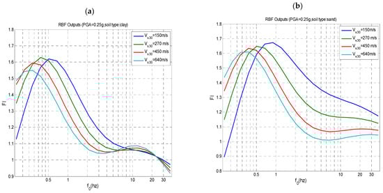 - For each profile set, we compute the , the average amplification factors (AFm), to constitute, for each soil type, a database of 3564 values and their associated variability , the mean amplification factor , and the associated initial variability . The results are displayed in Figure 6a,b for the clay and sand sets, respectively. The following main observations are derived: