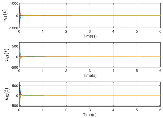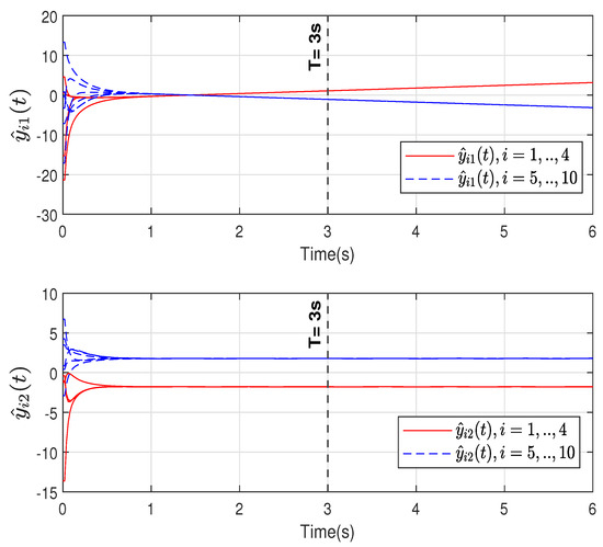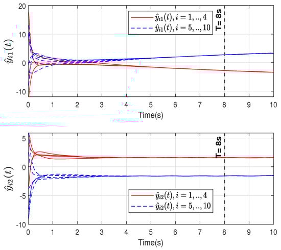 Figure 1 shows the communication topology denoting that a multi-agent system with 10 agents was divided into two groups, and ; let . Thus, the nonlinear dynamics of the agents are presented as follows: