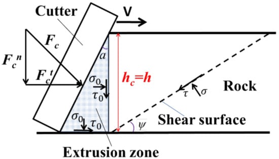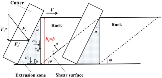 It can be seen from the photos of the PDC coring bits shown in Figure 1 that the drilling process results from the superposition of multiple single-tooth cutting and rock-breaking behaviors. To investigate the mechanism of rock cutting, previous studies proposed a quasi-static cutting model (QCM), as shown in Figure 2 [22]. This model represents the cutting state under the limiting condition of shear surface formation, referred to as the ‘limit cutting state’ in this study. The region formed between the cutter and the rock by the accumulation of cuttings is known as the extrusion zone or crushed zone. Since the formation of the failure surface follows the shear criterion [18,19,39], it is referred to as the shear surface in this study. To determine the geometric characteristics of the extrusion zone, the height of the extrusion zone, denoted as hc, is introduced to represent the length of its vertical projection. Once hc is determined, the other dimensions of the extrusion zone can be obtained through geometric relationships. As shown in Figure 2, hc in the QCM is considered equal to the cutting depth h.
