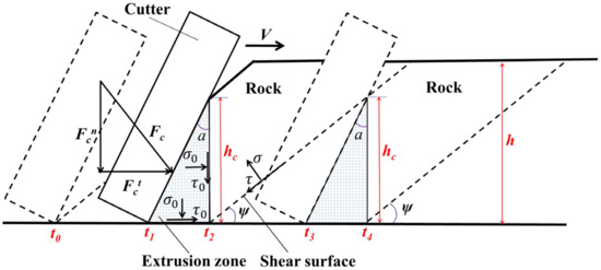 To analyze the dynamic characteristics of the cutting process, we expand the quasi-static cutting model (QCM) in Figure 2 from the perspectives of time and space, resulting in a dynamic cutting model (DCM) shown in Figure 3. The DCM illustrates the positional relationship between the cutter and the rock during two consecutive limit cutting states. Similarly to the QCM, the extrusion zone height hc is considered equal to the cutting depth h in the DCM. However, studies have shown that the height of the extrusion zone is not always equal to the cutting depth [35]. To address this, the DCM is further modified into a new dynamic cutting model (NDCM), as shown in Figure 4. Compared to the DCM, the most significant feature of the NDCM is that hc is treated as a variable, not equal to h.