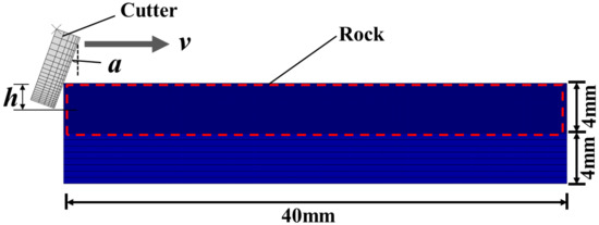 The bottom of the rock is fixed with a fully constrained boundary condition. A reference point is defined and attached to the tool for the application of cutting speed. The rake angle a is set by the relative position of the tool to the rock. A highly nonlinear surface-to-surface erosion contact is defined between the tool and the rock, with a friction coefficient u = 0.27 [42]. The numerical simulation utilizes the explicit dynamic solution module in the finite element software and accounts for geometric nonlinearity.