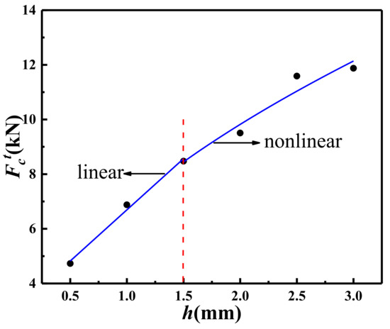 To verify the accuracy of the cutting model, a series of rock-cutting simulations with v = 35 mm/s and a = 20° are conducted to obtain the relationship between the mean tangential cutting force and cutting depth h, as shown in Figure 8. As the cutting depth increases from 0.5 mm to 3.0 mm, two distinct trends in the tangential force are observed: When h < 1.5 mm, there is a linear relationship between tangential force and cutting depth; when h > 1.5 mm, the relationship becomes nonlinear. This behavior is consistent with the experimental results from previous work by other researchers [44], confirming the accuracy of the cutting model developed in this study.