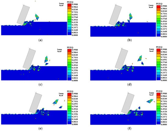 Figure 10. The equivalent plastic zone cloud diagram of six continuous shear surfaces at the time of generation in the schemes of a = 20°, v = 35 mm/s and h = 1.0 mm. (a) t = 0.2000 s, (b) t = 0.2263 s, (c) t = 0.2525 s, (d) t = 0.2788 s, (e) t = 0.3063 s, (f) t = 0.3350 s.