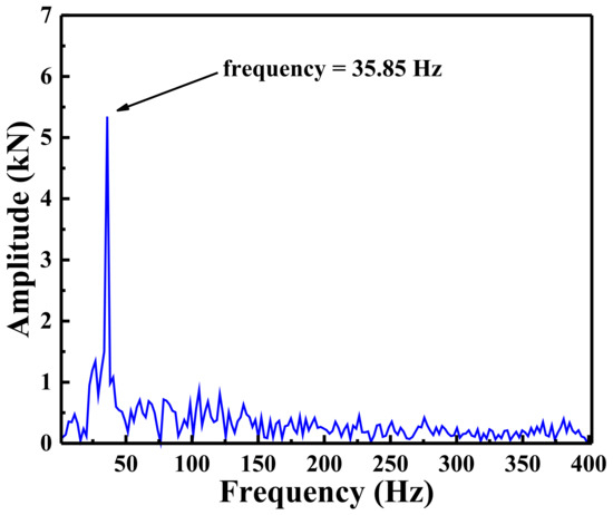 Moreover, the tangential cutting force in Figure 9 was analyzed using the fast Fourier transform (FFT), and its spectrum is shown in Figure 11. A significant peak appears at f = 35.85 Hz, indicating that the tangential cutting force Fct has a dominant frequency of 35.85 Hz. This frequency, obtained using the FFT method, differs by 3% from the fc-P value obtained through the plastic zone method. Additionally, it is noteworthy that there is some amplitude at frequencies other than the peak, suggesting the presence of signal components in other frequency bands. This can be attributed to the fact that, while the primary rock-breaking activity cycle occurs during the single cutting process, the formation of the extrusion zone is accompanied by small-scale rock-breaking activities.