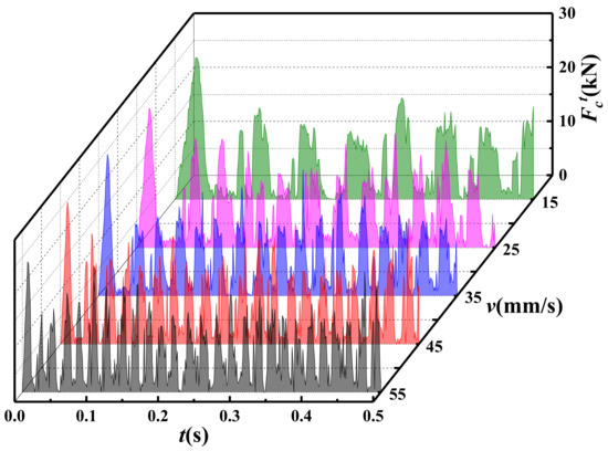 Accordingly, when the cutting depth h, cutting speed v, and rake angle a are determined, we hypothesize that the tangential cutting force Fct will oscillate periodically with the cycle of the single cutting process. Similar observations have been made in previous studies [25]. Inspired by these phenomena, the periodicity of the tangential cutting force Fct is proposed in this study. The tangential cutting force Fct will oscillate periodically with the cycle of the single cutting process (SCP) [25]. The duration and frequency of the single cutting process are defined as the cutting cycle Tc and the cutting frequency fc, respectively, which satisfy the following relationship: