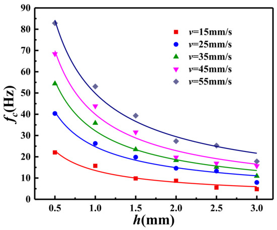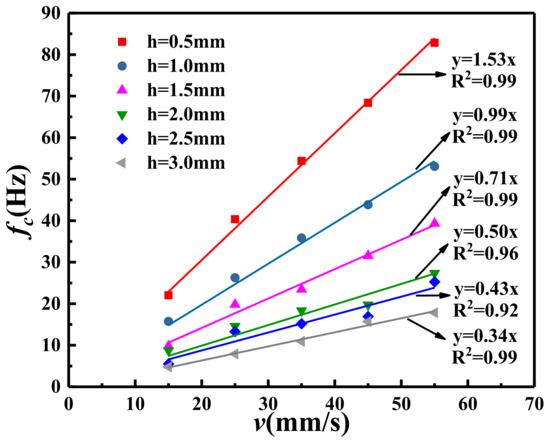 Figure 14. The relationship between cutting frequency and cutting speed in the schemes of a = 20° and h = 1.0 mm.
