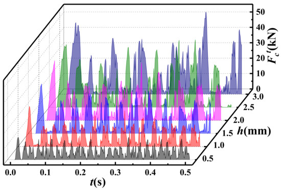 Figure 15. The variation in tangential cutting force with time under different cutting depths in the schemes of a = 20° and v = 35 mm/s.