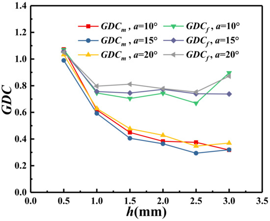 Figure 19. The variations in GDCf and GDCm with cutting depth in the schemes of v = 35 mm/s.