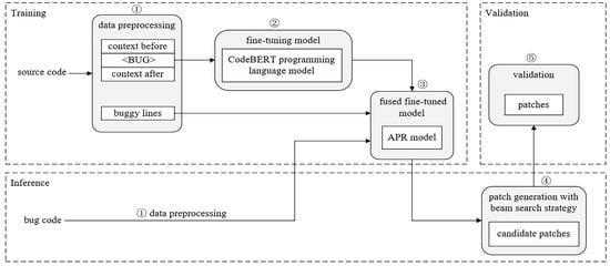 The approach used in the present study is summarized in Figure 1. CodeTransFix comprises three phases: training, inference, and validation. In the training phase, CodeTransFix first preprocesses the data (as shown in step ①) by extracting the bug lines and their surrounding contexts from the bug projects. After preprocessing, tokenized sequence data are obtained for the bug code and its context environment. Next, these sequences of context tokens are used to fine-tune the CodeBERT model to deeply understand the contextual features of the bug lines (as shown in step ②). Subsequently, CodeTransFix takes the context token sequences and bug code token sequences obtained from the preprocessing stage as inputs to train an APR model that focuses on bug code repair (as shown in step ③). This APR model is constructed by combining the fine-tuned CodeBERT model with the Transformer model to learn how to repair buggy codes based on contextual information.