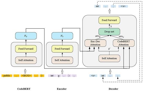 Second, a Transformer encoder-decoder architecture learns repair operations for buggy code. To fully utilize the knowledge learned by CodeBERT, we implement a Drop-net mechanism [15] to fuse contextual representations from CodeBERT’s output.