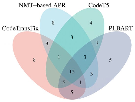 The extent to which CodeTransFix is able to complement existing NMT-based methods and approaches for buggy code repair using LLMCs is studied in further detail. In Figure 5, to explicitly demonstrate our method’s unique repair characteristics, the NMT-based APR approaches encompass three conventional systems (CURE [16], Recoder [12], and Reward [17]); LLMCs feature scaled implementations where CodeT5 [7] employs both small and base parameterizations while PLBART [8] adopts base and large model configurations. Figure 5 illustrates the overlap of bugs fixed using the different approaches. As shown in the figure, CodeTransFix fixes eight unique bugs. This finding indicates that it can be used in conjunction with other methods to significantly boost the number of correct patches produced.