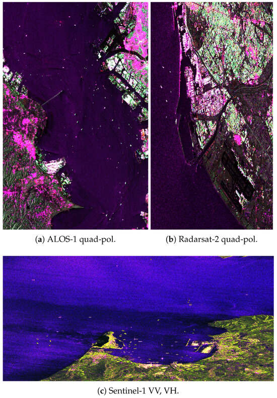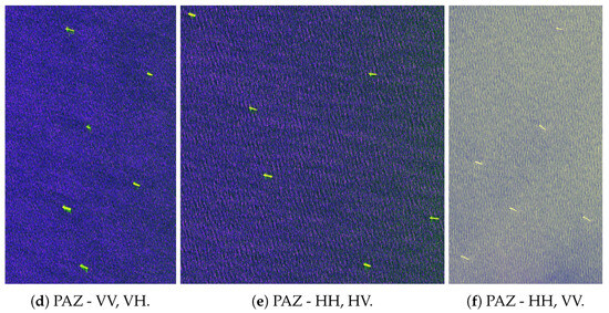 Figure 1 shows a false colour composite of each processed image, which corresponds to specific Regions of Interest (RoIs) within the full scenes. As can be seen in the RGB images, all ships exhibit specific polarimetric responses compared to their surrounding sea areas. This provides a simple way to visualize polarimetric diversity with the naked eye and demonstrates that polarimetry can be effectively exploited to develop sophisticated detection methods that leverage the additional information provided by polarimetric sensors. Actually, as detailed in [25], detection methods utilizing polarimetry, whether based on quad- or dual-polarimetric images, outperform those relying solely on the processing of single-channel intensities.