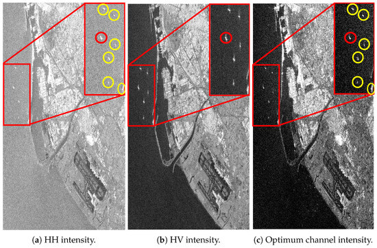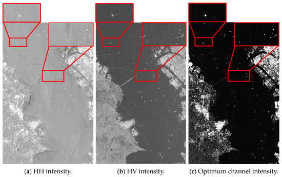 Figure 2 shows the results obtained with the quad-pol ALOS-1 dataset. Figure 2a,b represent the intensity of channels HH and HV, respectively, which are commonly employed as conventional detection channels. A lot of ships are clearly visible throughout the scene. As expected, the HV channel exhibits higher contrast between vessels and their surroundings compared to HH [25,33,34]. However, the response of some ships in HV is weaker than in HH, which might make their detection difficult. A drawback of the HH polarization is its higher signal level from the sea areas surrounding the vessels, which reduces the contrast (i.e., the signal-to-clutter ratio) between the vessels and the sea, thus limiting the application of automatic detection techniques to that channel.