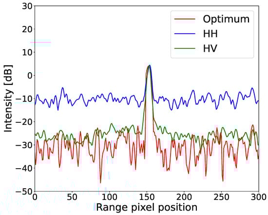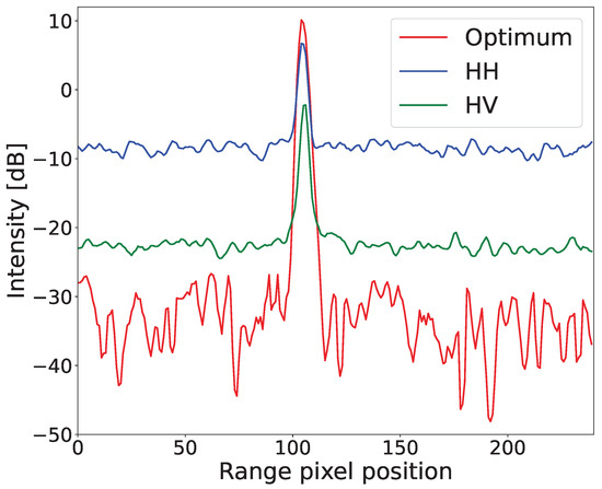 The improvement can also be visualized in Figure 3, which shows a range transect passing through the ship depicted in the magnified region at the top of Figure 2. On the one hand, by comparing the transects for the HH and optimum channels (blue and red plots), we observe that in the optimum channel, the ship intensity is approximately 3.5 dB higher, while (simultaneously) the sea clutter intensity is notably lower, dropping from around −8 dB to −40 dB. On the other hand, a similar effect is observed when comparing the transects corresponding to the optimum and HV channels (red and green plots, respectively). In this case, the ship intensity is about 12 dB higher, while the sea clutter intensity is observed to be 28 dB lower.