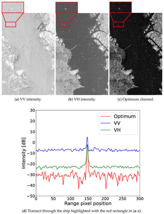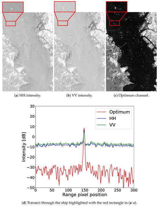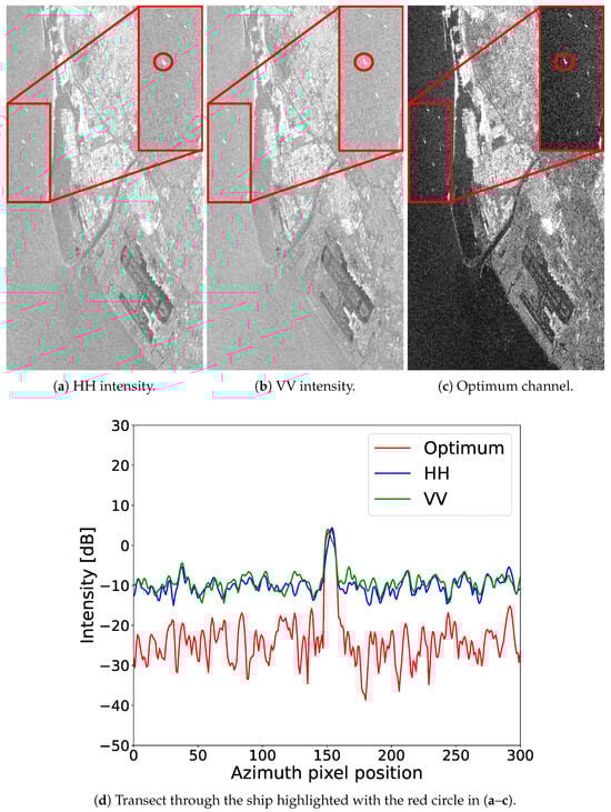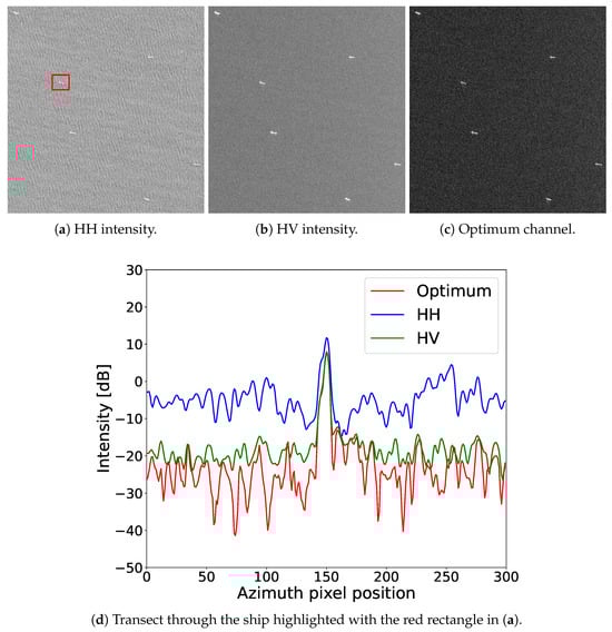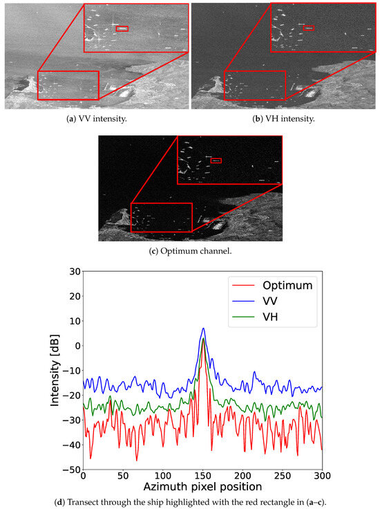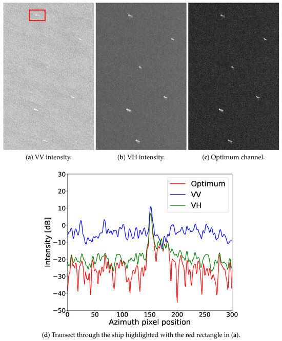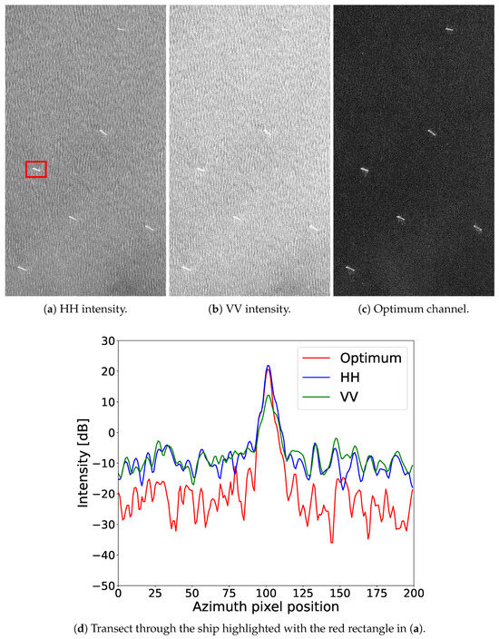 Numerically, the improvement is quantified for the three combinations of channels by estimating the signal-to-clutter ratio between a ship and the surrounding sea area. Specifically, we use the same ships as those in the transects shown in Figure 6d, Figure 7d, and Figure 8d, highlighted with red rectangles in Figure 6a, Figure 7a, and Figure 8a. The signal-to-clutter ratios are summarized in Table 4. The optimum channels provide consistently the highest signal-to-clutter ratio, regardless of the combination of polarimetric channels.