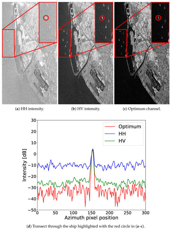 The second example corresponds to the quad-polarimetric image of Radarsat-2 acquired over Barcelona. The results are shown in Figure 4. As in the previous example, the steep incidence angle of the acquisition causes a strong response of the sea surface, particularly evident in the HH polarization, as depicted in Figure 4a. This results in a reduced signal-to-clutter ratio (contrast) between ships and their surrounding background, thereby limiting the effectiveness of detection techniques. HV provides again higher contrast than HH. However, upon closer inspection of the ships, their response appears to be scattered (or dispersed) across a wider area, as shown in the magnified region of Figure 4. In the optimum image represented in Figure 4c, we observe a clear cancellation of the signal coming from the sea surface, as well as an improved contrast between each vessel and its surrounding area. Figure 5 shows an azimuth (vertical) transect through the leftmost ship that appears in Figure 4 (highlighted with the red circle). Here, we observe that the HH polarization exhibits higher backscatter values for both the sea and the vessel (as previously stated), with an intensity difference of around 15 dB between the ship and the sea, as represented with the blue plot of Figure 5. Backscattered signals from the sea surface are notably reduced in the HV polarization, with an intensity difference of approximately 30 dB between the target vessel and its background (green plot). The signal-to-clutter ratio is clearly enhanced in the optimum channel, as illustrated by the red plot in Figure 5. The peak corresponding to the ship pixels is similar to that of HH and HV channels, but the average intensity level of the sea area is lower than that observed in the HV channel (around −35 dB), which indicates that it provides the highest contrast. As a further observation, examining the transects in Figure 3 and Figure 5, we notice significant fluctuations in very low intensity values in the optimum channel (ranging from −35 to −50 dB). These fluctuations are certainly caused by the presence of speckle in the estimation of the covariance matrices. It is important to note that a small filtering window of 3 × 3 pixels was used during estimation to minimize the loss of image resolution, resulting in a low equivalent number of looks. This leads to an inhomogeneous cancellation of sea clutter across all image pixels by means of the optimization process. Nonetheless, it is evident that sea clutter is consistently reduced compared to the original channels, and a similar effect will be observed when processing dual-polarization data.