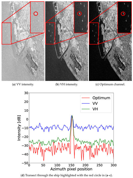 Additionally, as illustrated in Figure 14d and Figure 15d, ship intensity in the optimized channels is very similar to that of the cross-polar channels (HV and VH) (around 0 dB). However, the sea intensity level is significantly reduced, further demonstrating that the optimized channels provide the best contrast for ship detection.