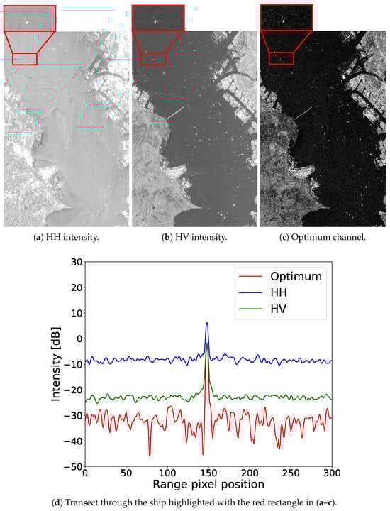 Optimization results of the dual-polarimetric HH/HV image acquired by PAZ over the coast of Rio Grande (Brazil). Figures (a–c) represent the image intensity in logarithmic scale ranging from −35 to 5 dB. Figure (d) represents a transect through the ship highlighted with the red rectangle in (a).