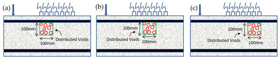 This study used distributed voids in a concrete block to resemble honeycombs inside RC. The size and shape of honeycombs are highly variable in reality. The distributed voids were packed within a square block with dimensions of 100 × 100 mm. Then, the block was placed under the top reinforcement centre, and aligned with the very left, the middle or the very right sensor, as shown in Figure 2. The voids were randomly packed within the block with different densities using a MATLAB (R2020a) code (Semechko, 2018) [14]. The diameter of the voids was chosen for efficient packing, so the required modelling effort was minimised.