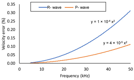 The velocity error VErr is related to the mesh density N by Equation (2) (Drozdz, 2008) [21], which is a function of the element size Le, wave frequency f and wave velocity v. Figure 3 shows that adopting a wave frequency of 50 kHz, the velocity errors for the R-wave and P-wave components could reach a maximum of 0.313%, which is considered insignificant.