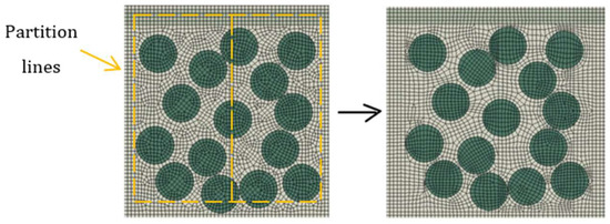 On the other hand, voids were modelled as “acoustic media” using a four-node linear 2D acoustic quadrilateral element with reduced integration. Distributed voids took the shape of circles and were randomly packed within the block, which created much distortion in the mesh. The elements around the voids were extremely irregular, which would drastically deteriorate the accuracy of the model if left unmodified. This study first tried partitioning the faces around the voids and applied a medial algorithm with the mesh control. An improvement in the mesh can be observed in Figure 4.