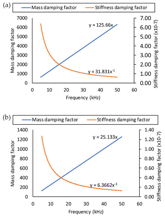 For RC with small stress intensity (no void), the damping ratio for concrete, ξconcrete, is between 0.007 and 0.010. For steel reinforcement, the damping ratio, ξsteel, is between 0.001 and 0.002 (Mahrenholtz & Bachmann, 1995) [23]. Based on the values suggested, the initial damping ratios were assumed. Through further calibration with the experimental data, the final damping ratios used by the model were 0.010 for the concrete and 0.002 for the reinforcing steel. The mass and stiffness damping coefficients were calculated using Equations (4) and (5). The presence of angular frequency, ω, in the equations suggests that the damping depends on the wave frequency. The variations in the damping coefficients for concrete and steel are shown in Figure 5.