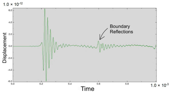In this study, a total wave simulation period of 0.001 s with a time step increment of 5 × 10−7 s was used. Demolding the explicit scheme is merely conditionally stable. The stability condition of the explicit modelling scheme was established by determining a suitable critical integration time step , known as the Courant–Friedrichs–Levy stability condition (Courant, et al., 1928) [22]. Using the simulated maximum wave frequency fmax of 50 kHz, was obtained as 1 × 10−6 s using Equation (3) (Swanson Analysis Systems, 1992) [19].