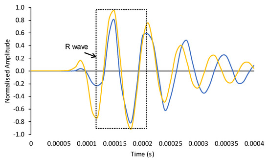 R-waves travel radially with a spherical waveform. They have been known to carry more energy than the body waves (primary and secondary waves), and the majority of the energy is concentrated near the surface of the medium that they propagate. This characteristic makes R-waves relatively easy to detect at the medium surface (Sansalone, et al., 1987) [26], and the change in their velocity and amplitudes are useful indicators that can be quantified against the change in the physical state of the medium through which they propagate. For transient waves, the R-wave arrival is often identified by locating either the first positive or negative waveform peak of the first-arriving wave packet. Therefore, a calibration of the waveform was carried out to obtain the best match between the first positive and negative peak amplitudes of the waves collected from experimental measurements and the numerical simulation, in which the elastic waves were generated on a plain concrete surface at a point 170 mm from the sensor. Details of the experimental measurements are reported elsewhere by the authors (Lee, et al., 2016) [27]. In the results analysis, the collected waveforms were normalised for amplitude against the highest positive peak for ease of comparison. Regression analysis and correlation analysis were then carried out to compare the experimental and the numerical waveforms. The superposed waveforms are shown in Figure 7. The coefficients obtained from the regression and correlation analyses are 0.950 and 0.975, indicating satisfactory calibration, which also validated the suitability of the afore-described waveform simulation configurations.