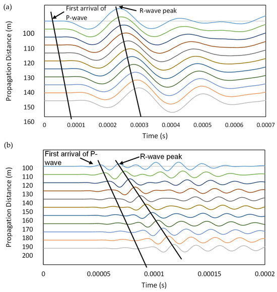 When elastic wave excitation is located very close to the sensor position, there is a possibility that the R-wave component cannot be completely distinguished from the P- and S-waves in the detected waveform (Park, 2001) [29]. This phenomenon is widely termed the “near-field” effect. This can result in inaccurate velocity measurements of R-waves. To avoid erroneous measurements, a sufficient travel distance for R-waves must be allowed in the measurement. The recommended minimum spacing is 150 mm, as stated in Sansalone & Streett (1997) [30], which should work well with general types of impact elastic waves. Compiled from the results of the simulations conducted for this current study, Figure 8 shows some examples of waveform data collected at incremental propagation distances for 5 kHz and 50 kHz excitations. At 170 mm of wave travel distance, a clear separation between the first-arriving R-waves and the P-waves can be observed.