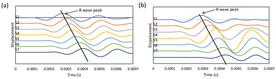 Stacked waterfall plots with an excitation frequency of 5 kHz for (a) 10% void and (b) 100% void models. Displacement is a normalised value.