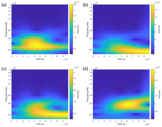 CWT plots for wave data with dominant excitation frequency of 5 kHz for (a) 10% and (b) 100% voided cases acquired at Sensor 4; and (c) 10% and (d) 100% voided cases acquired at Sensor 7.