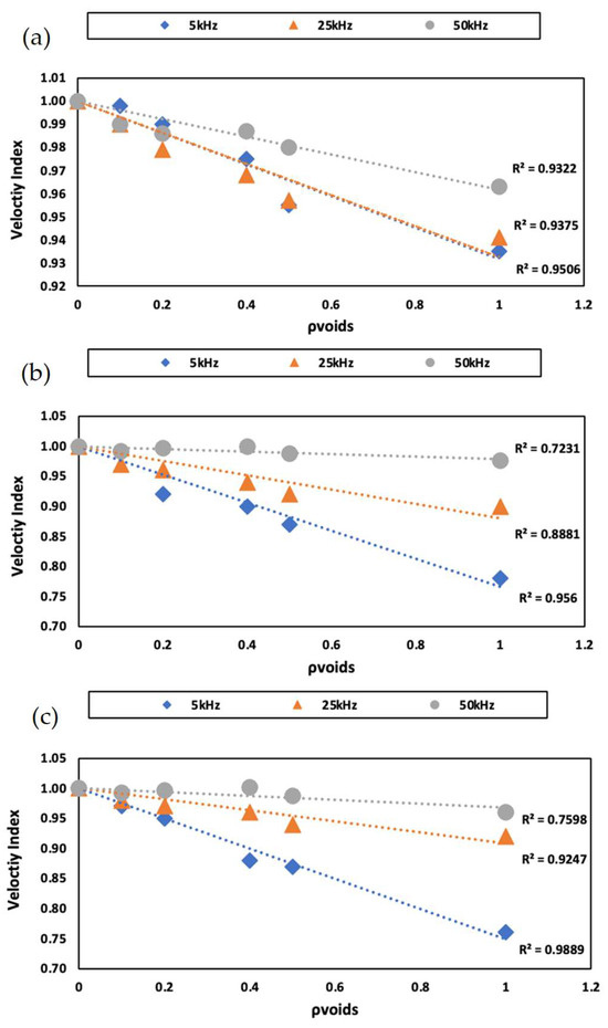 where VDefected and VSound are the velocities of R-waves in the voided (defect) and unvoided (sound) models, respectively. Both VDefected and VSound were obtained by calculating the gradient value of the linear regression for wave propagating distance versus propagation time plots, which is obtained by extracting the data acquired from each of the sensors for all the cases modelled and simulated. In general, the velocity index is found to decrease with void density, giving a good linear correlation in all cases covered in this study. For the cases of 5 kHz excitation frequency, the change in velocity index against void density is found to be more significant than that of the 50 kHz cases. This is most likely due to the longer wavelength given by the 5 kHz excitations, resulting in higher penetration depths of the R-waves and the waves being more easily distorted by voids.