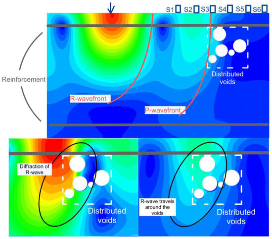 The wavefront of an R-wave is distorted when it encounters voids in its path. This distortion occurs due to diffraction, which occurs when the wave interacts with the boundaries (edges) of the void, particularly when the void size is comparable to the R-wave’s wavelength. In such cases, the wave bends around the void, rather than simply being blocked. Additionally, as the R-wave propagates through or around the void, scattering occurs, producing a complex wavefield behind it. This wavefield consists of multiple zones with varying amplitude strengths and phase relationships due to interference patterns. When multiple voids are present, dispersion takes place as the wave energy is redistributed in two ways: partial transmission through or around the empty space and reflection (which depend on the void’s size, shape, material properties), and the R-wave’s incidence angle.
