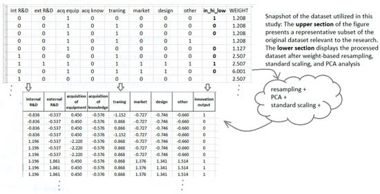Entries were labeled as either “Low Innovation” (0) or “High Innovation” (1), depending on their aggregated innovation outcomes. To mitigate class imbalance and eliminate the need to maintain original sample weights during training, a resampling strategy was implemented, resulting in a balanced final dataset of 1696 observations. This balanced dataset comprised 855 entries categorized as Low Innovation (innovation sum ≤ 2.0) and 867 entries categorized as High Innovation (innovation sum ≥ 4.0); entries corresponding to an innovation sum of 3.0 were omitted to achieve a more balanced distribution. Consequently, each instance within this final dataset includes all eight input variables (in binary format) and the single binary output variable, reflecting the level of innovation intensity.