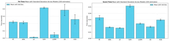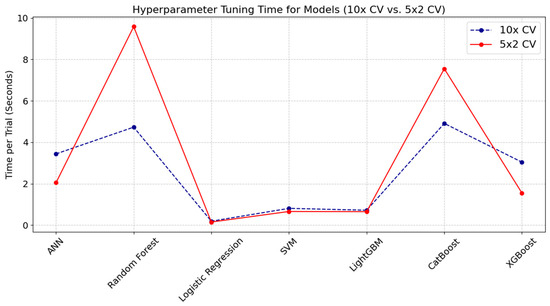 Figure 2 illustrates the hyperparameter tuning time per trial for the 10-fold CV and 5 × 2 CV approaches accordingly. The chart reveals that Random Forest and CatBoost models incurred noticeably higher tuning times with the 5 × 2 CV compared to the 10× CV approach, indicating that models exhibiting greater complexity or sensitivity to data partitioning may experience additional computational overhead due to different train/test split ratios. By contrast, Logistic Regression, SVM, and LightGBM produced minimal differences in tuning time between the two referent strategies, reflecting the stability and lower complexity of these algorithms. Unlike the other models—where tuning times for 10× CV were generally lower than those for 5 × 2 CV—ANN and XGBoost models exhibited slightly higher tuning times for 10× CV compared to 5 × 2 CV.