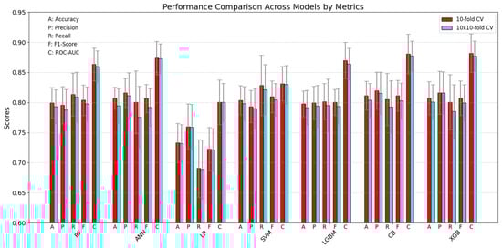 The hyperparameter tuning experiments yielded insights into model performance and computational requirements under two cross-validation (CV) approaches—10-fold cross-validation (10× CV) and 5 × 2 cross-validation (5 × 2 CV)—across all seven machine learning algorithms included in this study: Artificial Neural Networks (ANN), Random Forest (RF), Logistic Regression (LR), Support Vector Machines (SVM), LightGBM (LGBM), CatBoost (CB), and XGBoost (XGB). The fine-tuned hyperparameters for each model are reported in Table 3.