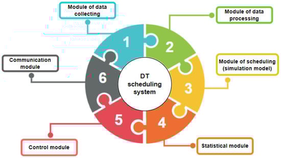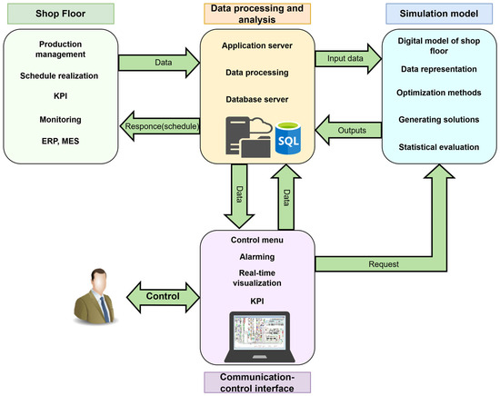 With the rise of smart manufacturing, businesses are increasingly embracing new information technologies such as the Internet of Things (IoT), cloud computing, big data, and artificial intelligence. These technologies are deployed to increase the efficiency and flexibility of production processes [1,2]. These technological advances have also resulted in the emergence of new manufacturing models, such as cloud manufacturing, green manufacturing, and service-oriented manufacturing [3,4]. These models are designed to meet the new demands of today’s manufacturing—socialization, personalization, service delivery, and intelligence [5]. Scheduling production within custom manufacturing plays a very important role today, especially in the context of the dynamic needs of smart manufacturing systems [1,5]. Intelligent production planning must meet new, complex goals that go beyond those of traditional approaches. The main requirements include ensuring real-time production flexibility [6,7]. Modern manufacturing companies often encounter a huge number of operations and complicated relationships between individual production processes [8]. These processes are often highly interconnected and require a continuous flow of information and materials [9]. As a result of the dynamic environment in the company, where unexpected changes or failures can occur at any time, the continuity of the entire production system can be disrupted. Therefore, it is essential to react quickly to dynamic events to ensure production continuity and efficiency [10,11]. In addition, uncertain events are often present in production processes, which can lead to information asymmetry between the planned and actual production process [12]. This may affect the achievement of the set production targets. Static planning that does not consider these dynamic changes can cause a significant difference between the original plan and the actual course of production. The result is the waste of production resources, increased costs, and reduced efficiency [13,14]. Therefore, in modern manufacturing companies, it is important to include dynamic planning strategies in planning processes, which can flexibly respond to the current state of production, thus enabling the more efficient use of resources and the optimization of production in real time [15]. For short-term planning based on a digital twin, the solution needs to have the following properties: connectivity, modularity, parametrization, controllability, and the possibility to visualize the outputs and consider the complexity of production [16]. A digital twin consists of a physical and a virtual space that communicate through channels. The virtual space collects data from the physical space (machines, MES, ERP), which are then used for simulations and production plans [17,18,19].
