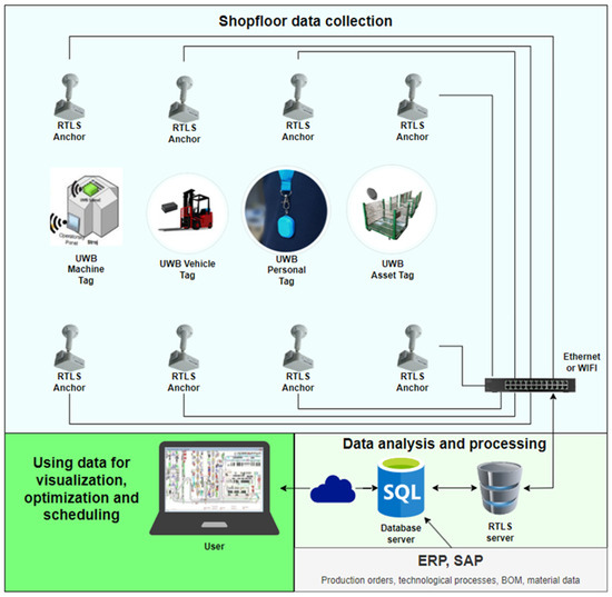 In this case study, a real-time location system (RTLS), which is based on ultra-wideband (UWB) technology, is used. A schematic representation of the data collection process is shown in Figure 2. This combination of technologies is chosen due to their high accuracy and ability to resist electromagnetic interference, which could affect the performance of other communication technologies. Individual UWB tags are placed on all monitored objects within the production process, including operators, machines, and logistics equipment. These devices communicate with stationary anchors (RTLS anchors) located throughout the production area, which then ensure the transfer of data to a central server.