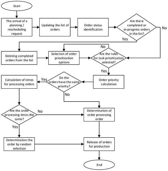 After the arrival of a request for scheduling or the adaptation of the schedule for various reasons (arrival of new orders, change in order priority, deviation from the plan, etc.), a simulation run is started, where the list of orders will be updated using the control method and their status will be identified. An order can already be sorted, in a pending state or a work-in-progress state, and executed. Executed orders will be deleted from the list, orders in a work-in-progress state will have to be processed, and new and unfinished orders will undergo a sorting evaluation and will be reordered for release into production. The logic of the order prioritization system is shown in the diagram below (Figure 3). The value of the order priority factor is influenced by several factors, namely