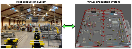 A schematic representation of the modular structure is shown in Figure 1. The data collected are divided into static, dynamic, and random data and can come from different sectors within the company (logistics, maintenance, production, etc.). Production equipment is usually monitored using sensors and technologies such as RTLS, Bluetooth, Wi-Fi, RFID, optical sensors, or AI recognition. Communication systems are divided into levels ranging from sensors to cloud solutions, with the choice of technology depending on the requirements for reliability, speed, and the volume of data transmission. The efficient interconnection of production data and simulation models allows for accurate planning and a quick response to changes in production, increasing the productivity and flexibility of the production process [16].