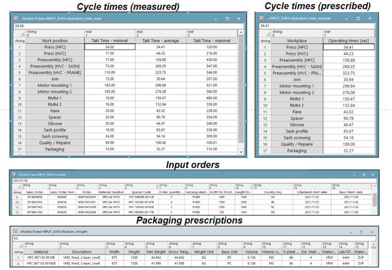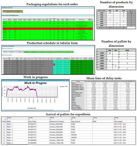 The following Figure 11 shows the other outputs that were acquired by the proposed production scheduling system. All the obtained results can be used not only for production management but also for presentation purposes, the in-depth analysis of the system, knowledge systems, etc.