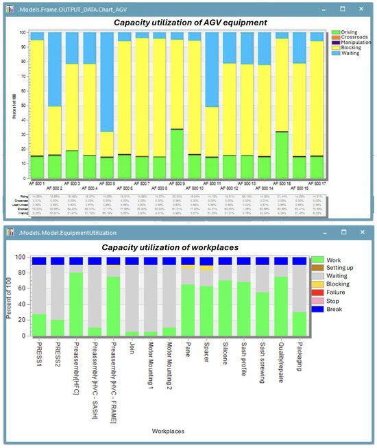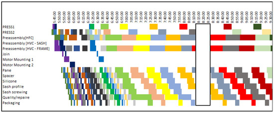 As part of the creation of variant solutions for the production schedule, data on the utilization of production assets and AGVs during the simulated period were automatically collected. Figure 9 shows the resulting Gantt chart created in the simulation environment. It captures the sequence and duration of individual production operations (for example, PRESS1, PRESS2, preassembly, join, motor mounting, etc.). Each row represents a separate workplace or work operation, while the horizontal color blocks show when and for how long a given task is performed. The horizontal axis shows a time scale. The chart is used to verify whether the proposed digital twin and control algorithms can plan production more efficiently than the original or conventional methods. The graphical display shows the reduction in the total production time (makespan) and the time saved until the end of the shift, as well as the achieved economic savings (evaluated in the table with plan variants—Table 2).